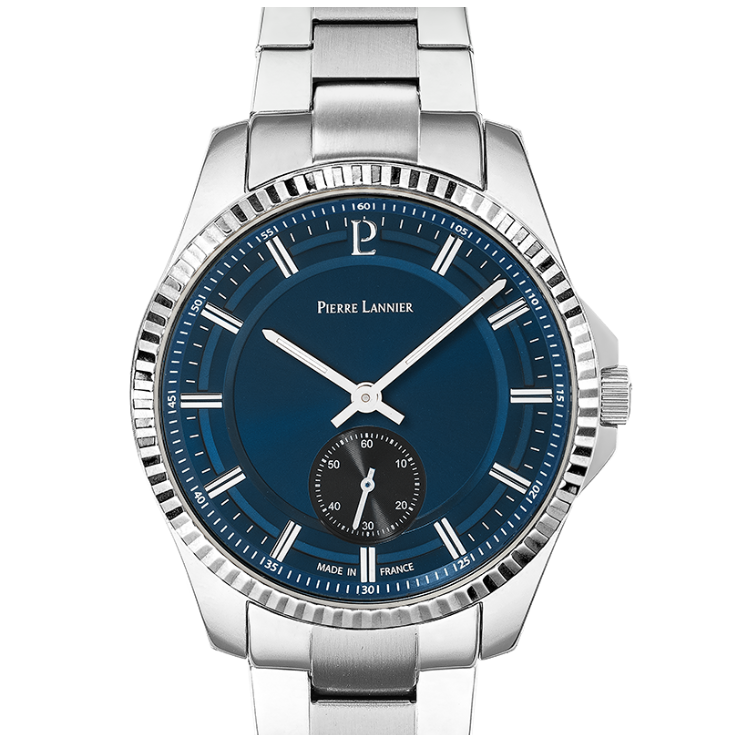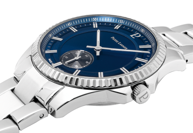 Cette montre quartz, fabriquée en France, dévoile un boîtier poli-brossé de 40 mm agrémenté d'une lunette cannelée et d'un protège-couronne dominant.