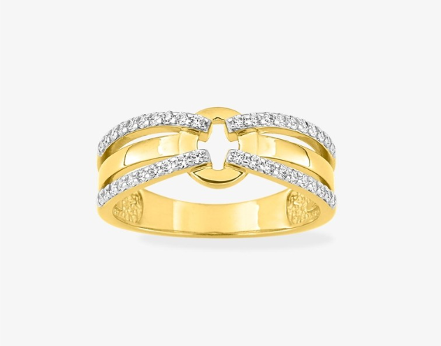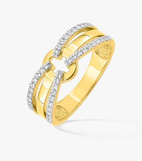 Bague en plaqué or, élégamment conçue en anneaux entrelacés et ornée d'un oxyde de zirconium blanc scintillant. Légère avec ses 2,31 g, elle est confortable à porter au quotidien. Cette bague allie élégance et modernité, parfaite pour toute occasion.