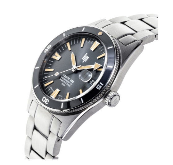 Dotée d’un boîtier de 39 mm en acier inoxydable 316L brossé, la Nautic 666 assure une protection maximale contre la corrosion et les chocs. Elle est équipée d’une lunette tournante unidirectionnelle de 90 clics, avec un insert en aluminium anodisé gris, garantissant à la fois une grande fonctionnalité et un aspect esthétique unique. Le cadran noir soleillé, d’une finesse remarquable, recouvre le calibre LIP R26, un mouvement mécanique à remontage automatique fabriqué à Besançon. Ce calibre historique marque une étape importante dans l’histoire de LIP, étant le premier mouvement automatique produit depuis les ateliers bisontins après Fred LIP.