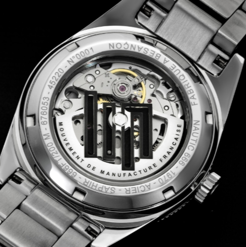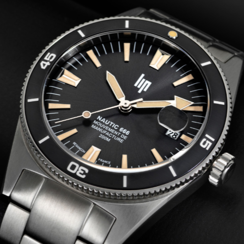 Parfaite pour les passionnés de plongée et de sports nautiques, la Nautic 666 est protégée par un verre saphir légèrement bombé, traité antireflet sur les deux faces pour une lecture optimale, même dans des conditions de faible luminosité. Le dateur est équipé d’une loupe pour faciliter la lecture. De plus, les index luminescents « old radium » assurent une visibilité excellente, même dans l’obscurité et sous l’eau. Le bracelet de cette montre de plongée est en acier inoxydable 316L brossé avec trois rangées de maillons, offrant un parfait équilibre entre souplesse et robustesse. Il est doté d’une boucle déployante de sécurité, garantissant un maintien fiable et un confort optimal. Le fond transparent vissé, orné d’un verre plat, permet d’observer le mouvement automatique de fabrication française, tout en dévoilant le balancier oscillant à 3 hertz. Le logo LIP est visible à travers les mouvements de la masse oscillante, ajoutant une dimension esthétique à son fonctionnement technique. Avec une étanchéité garantie jusqu'à 200 mètres de profondeur, la Nautic 666 est une montre de plongée exceptionnelle. Bien que chaque modèle soit numéroté individuellement, cette montre n’est pas une édition limitée, offrant ainsi une disponibilité continue pour les collectionneurs et les amateurs de belles montres.