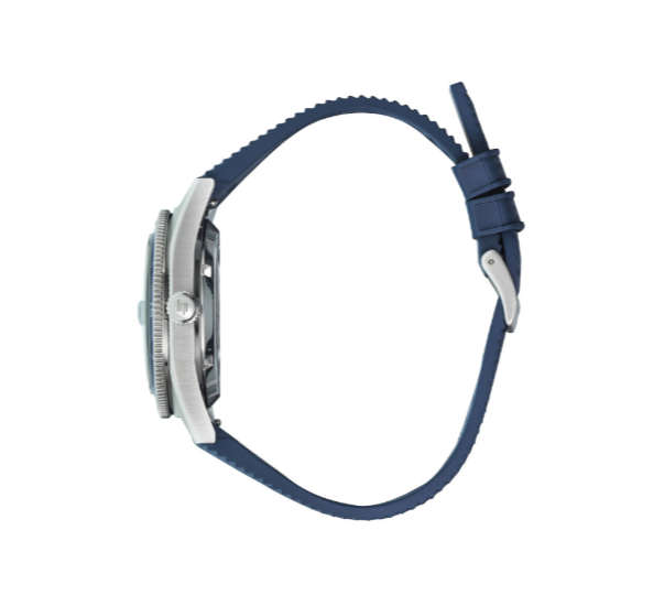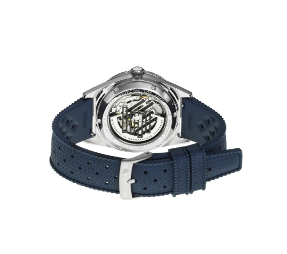 Le bracelet de la Nautic 666 est en élastomère bleu, offrant à la fois confort et robustesse, et se ferme avec une boucle ardillon chromée, estampillée du logo LIP. Le fond transparent vissé, surmonté d'un verre plat, permet d'admirer le mouvement automatique de fabrication française. On y découvre le grand balancier oscillant à 3 hertz, garantissant une précision optimale, et le logo LIP se dévoile à travers les mouvements de la masse oscillante.