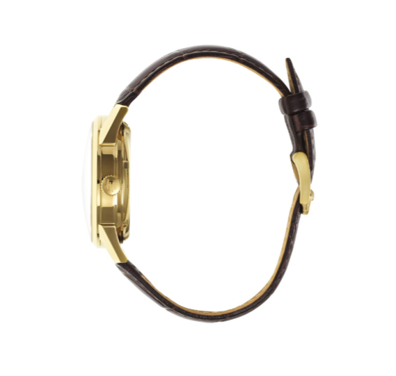 Son bracelet en cuir véritable marron embossé alligator, fermé par une boucle ardillon chromée exclusive à LIP Manufacture, allie confort et élégance. Le mouvement automatique, entièrement visible à travers le fond transparent vissé avec un verre plat, permet d’admirer le grand balancier oscillant à 3 hertz, garantissant une précision optimale. Le logo LIP apparaît subtilement au fil des mouvements de la masse oscillante.