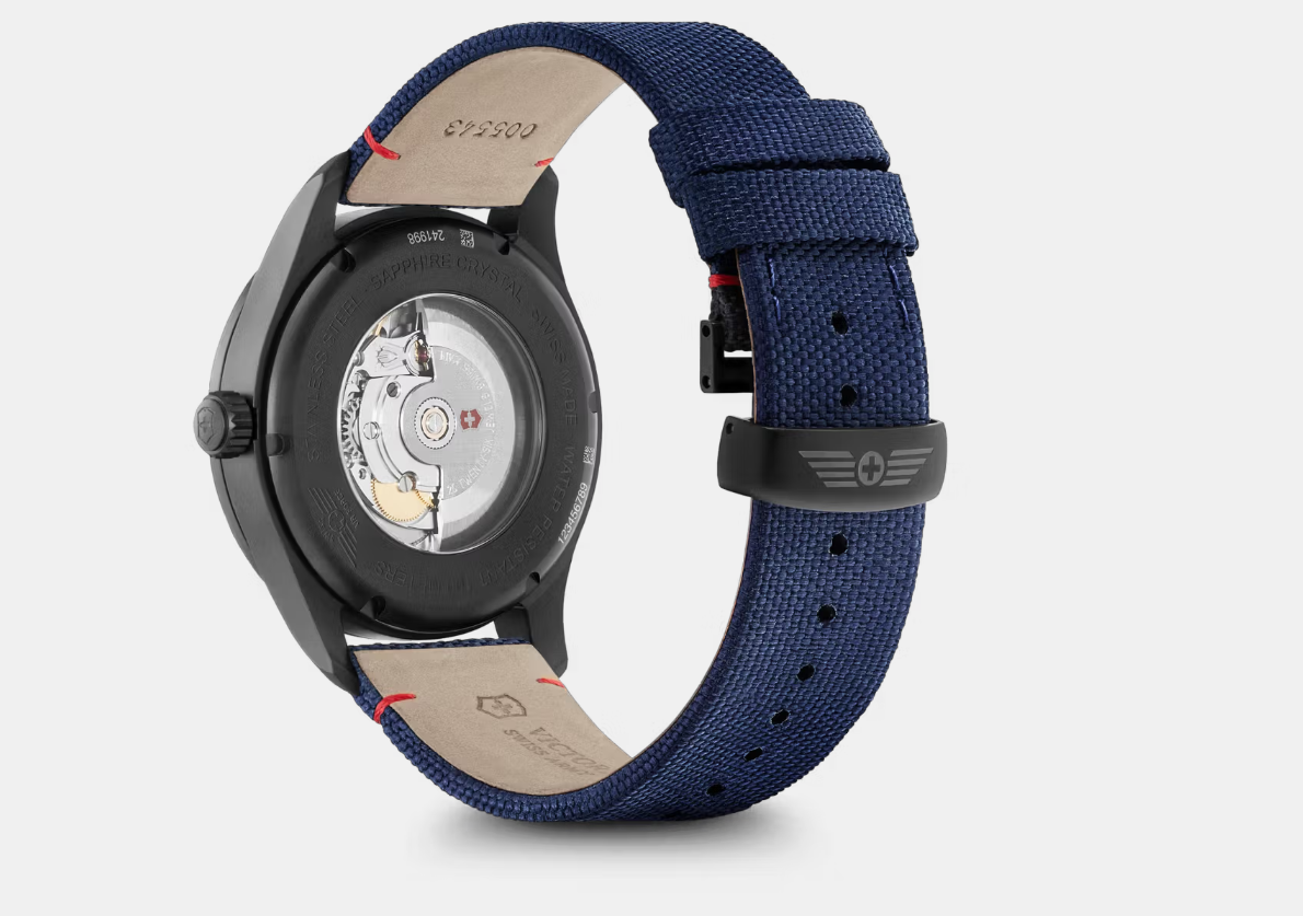 Mouvement à remontage automatique Sellita SW200-1 fabriqué en Suisse visible à travers le fond transparent
