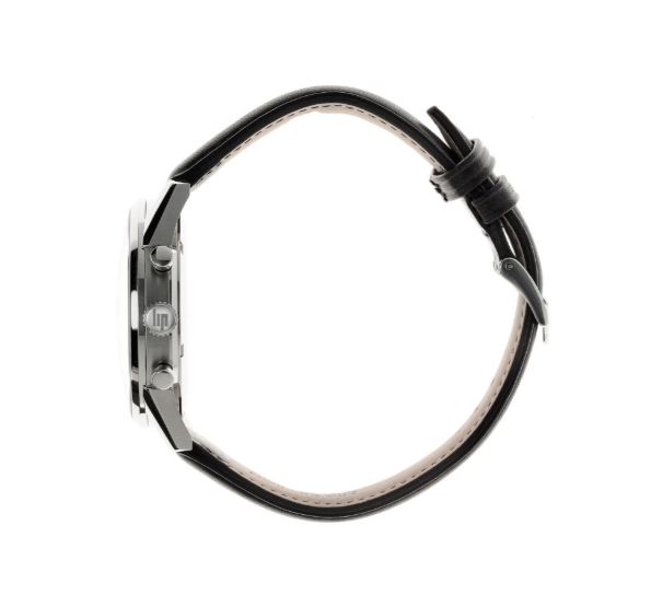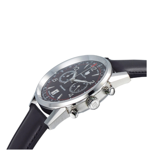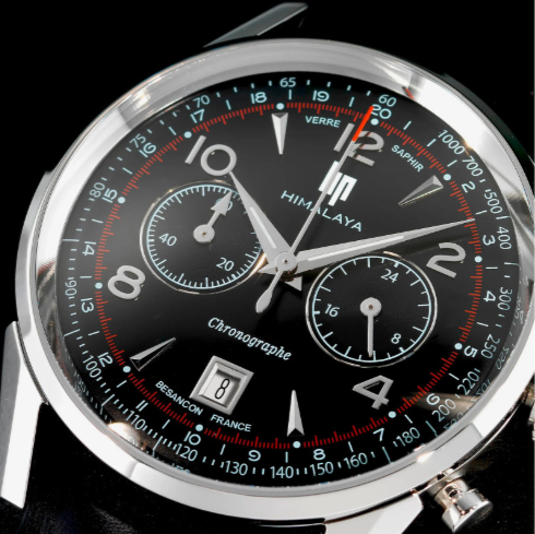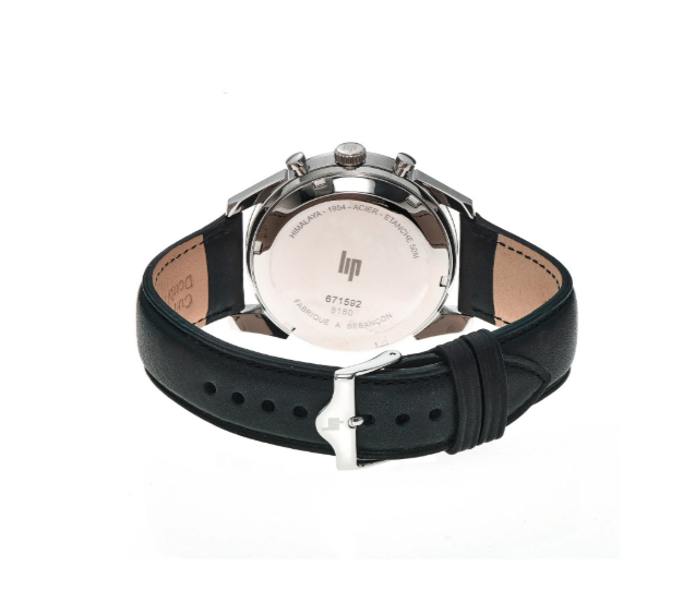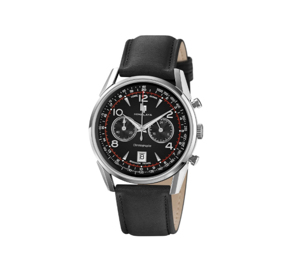 Ce chronographe Lip Himalaya possède un boîtier poli et brossé en acier inoxydable 316L. En plus de sa fonction de chronographe à la seconde jusqu'à 60 minutes, il mesure les temps intermédiaires, affiche les fonctions tachymètre et télémètre ainsi qu'un guichet date et une aiguille 24h. Etanche à 50 m, il possède un fond de boîte vissé ainsi qu'un verre saphir traité antireflet, son bracelet en cuir de vachette noir lisse surpiqué en ton sur ton est fermé par une boucle ardillon. Son cadran noir recouvert d'index et d'aiguilles argentés procure à cette montre un look à la fois sportif et moderne. Une montre sport, confortable, résistante, à porter sans modération.