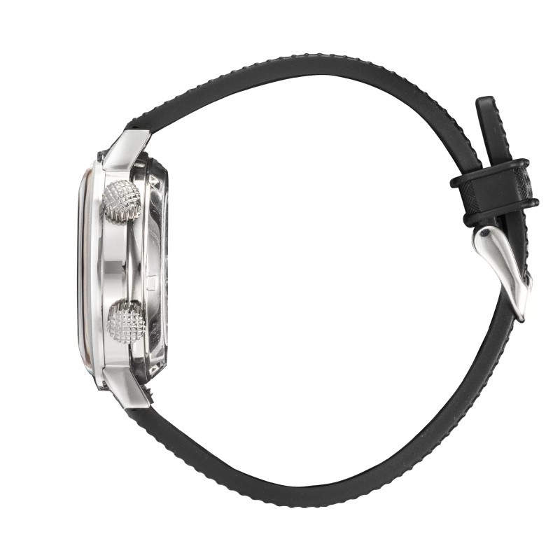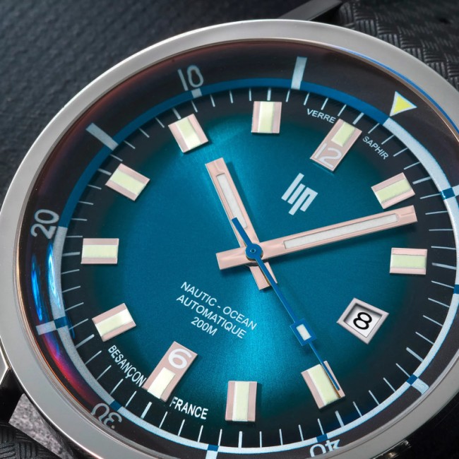 Montre sportive par excellence de la collection Lip, La Nautic-Océan dans son grand format de 41mm, présente toutes les qualités requises pour répondre aux besoins spécifiques de la plongée. Son boîtier, de type super-compressor en acier inoxydable 316L assure une parfaite étanchéité affichée à 200 m et abrite un mouvement automatique d'une fréquence de 21600 alternances/heure que vous pouvez admirer en fonctionnement grâce au fond de boîte transparent vissé. Sur son cadran couleur bleu océan soleillé, recouvert d'un verre saphir traité antireflet, reposent index et aiguilles habillés de Super Luminova pour garantir une lisibilité maximum, même dans les profondeurs. Son bracelet en caoutchouc vulcanisé noir perforé, vous assure un confort parfait en plongée ou dans vos activités quotidiennes. Ses deux couronnes ont été surdimensionnées pour faciliter la préhension avec des gants et l'une d'entre elle vous permet d'activer la lunette interne bleue foncée pour le calcul du temps de plongée. Un modèle phare, sportif et identitaire, livré dans un coffret spécifique.