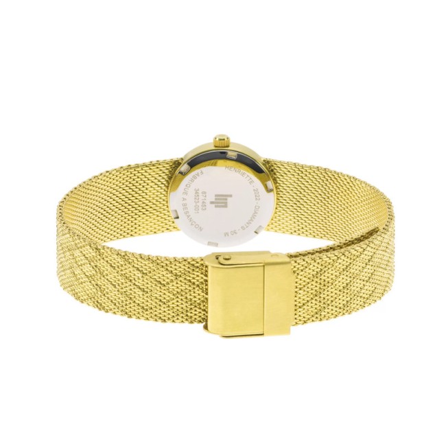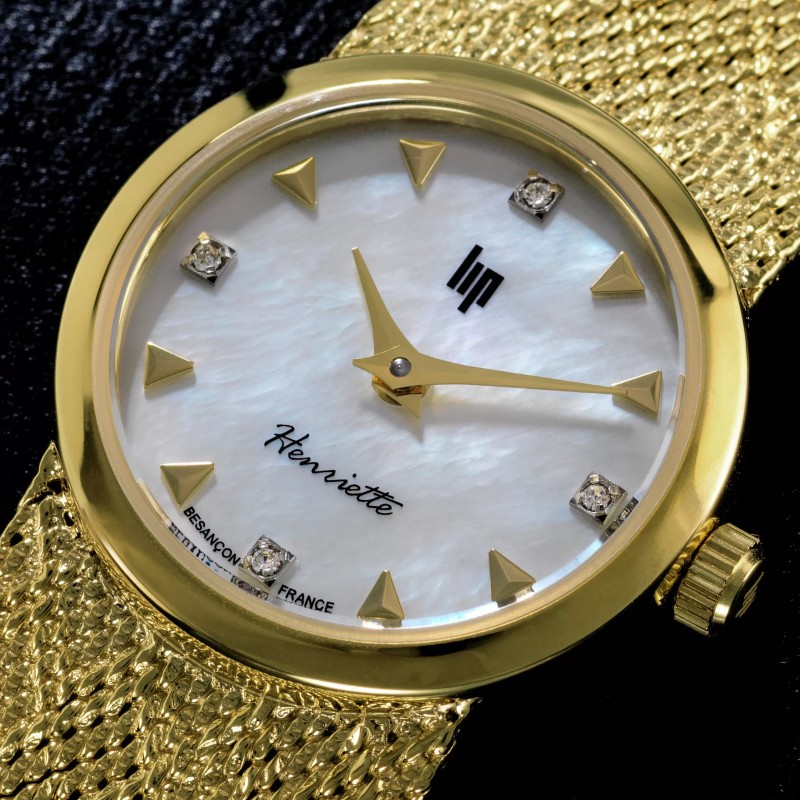 Ce modèle Lip Henriette au boîtier doré de 22 mm est paré d'un cadran nacré, réhaussé de 4 diamants en index. Son bracelet doré en mailles polonaises ajustable, vous habillera le poignet avec classe et élégance. Une montre qui saura se faire remarquer à coup sûr et qui plus que vous procurer l'heure, vous ornera majestueusement le poignet.