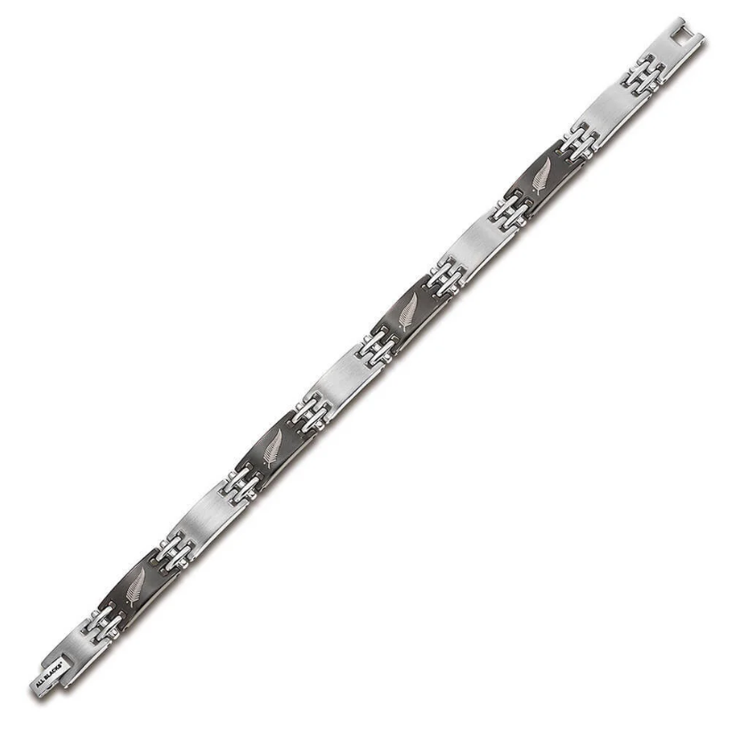 Ce bracelet est caractérisé par des maillons noirs et acier constellés du logo de l’équipe néo-zélandaise. Alternativement agencés, ces mêmes maillons confèrent au bijou un caractère élégant et urbain en même temps.