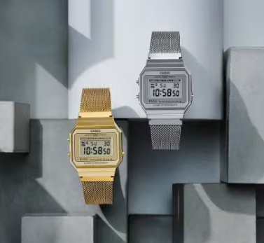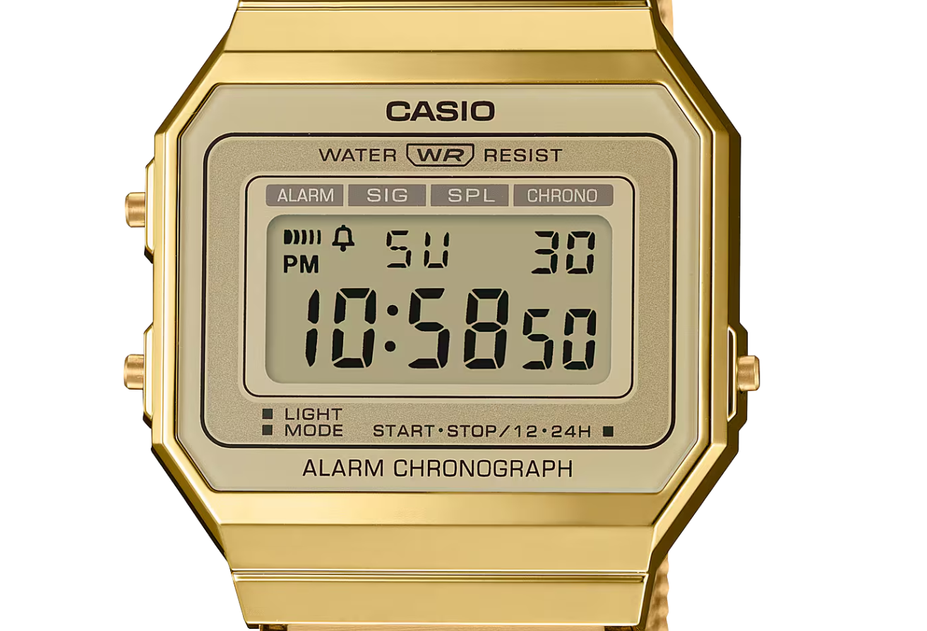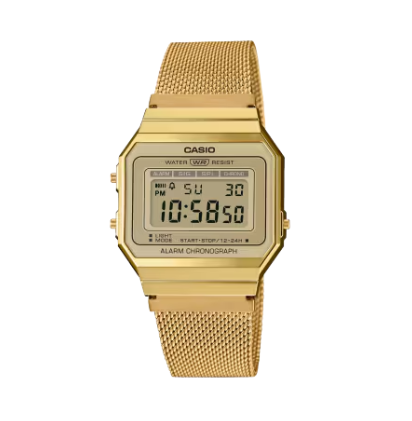 Collection Vintage • BOÎTIER ULTRAFIN • Résistant à l'eau • Rétroéclairage LED • Chronomètre à 1/100e de seconde • Alarme quotidienne • Bracelet en maille d'acier inoxydable