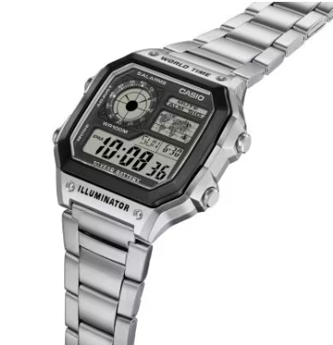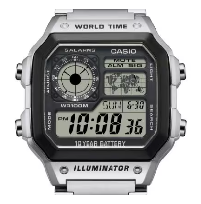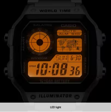 Voici le AE-1200WHD - style et fonction en parfaite harmonie ! Cette montre impressionne par sa pile d'une durée de 10 ans. Le chronomètre 1/100e de seconde apporte de l'action à votre jeu de chronométrage. Avec l'heure universelle et la carte du monde intégrée, vous avez le globe au poignet. Et si cela ne suffit pas, 5 alarmes quotidiennes vous aideront à tenir toute la journée. Le tout est complété par un éclairage LED et une étanchéité jusqu'à 10 bars - voilà votre montre prête pour l'aventure ! • DURÉE DE VIE DE LA BATTERIE DE 10 ANS • Chronomètre au 1/100e de seconde • Carte du monde pour l'heure mondiale • 5 alarmes • Éclairage LED • Étanche jusqu'à 10 bar