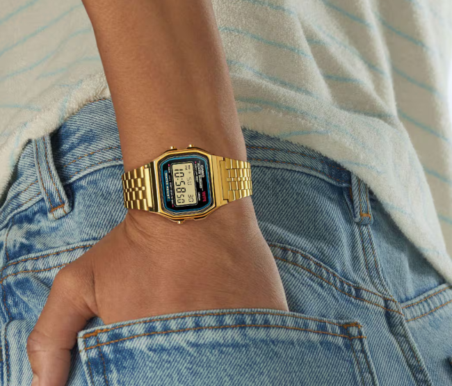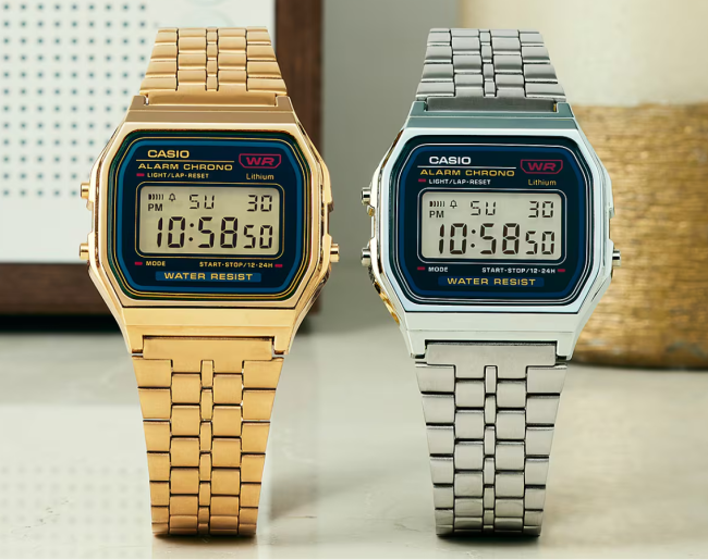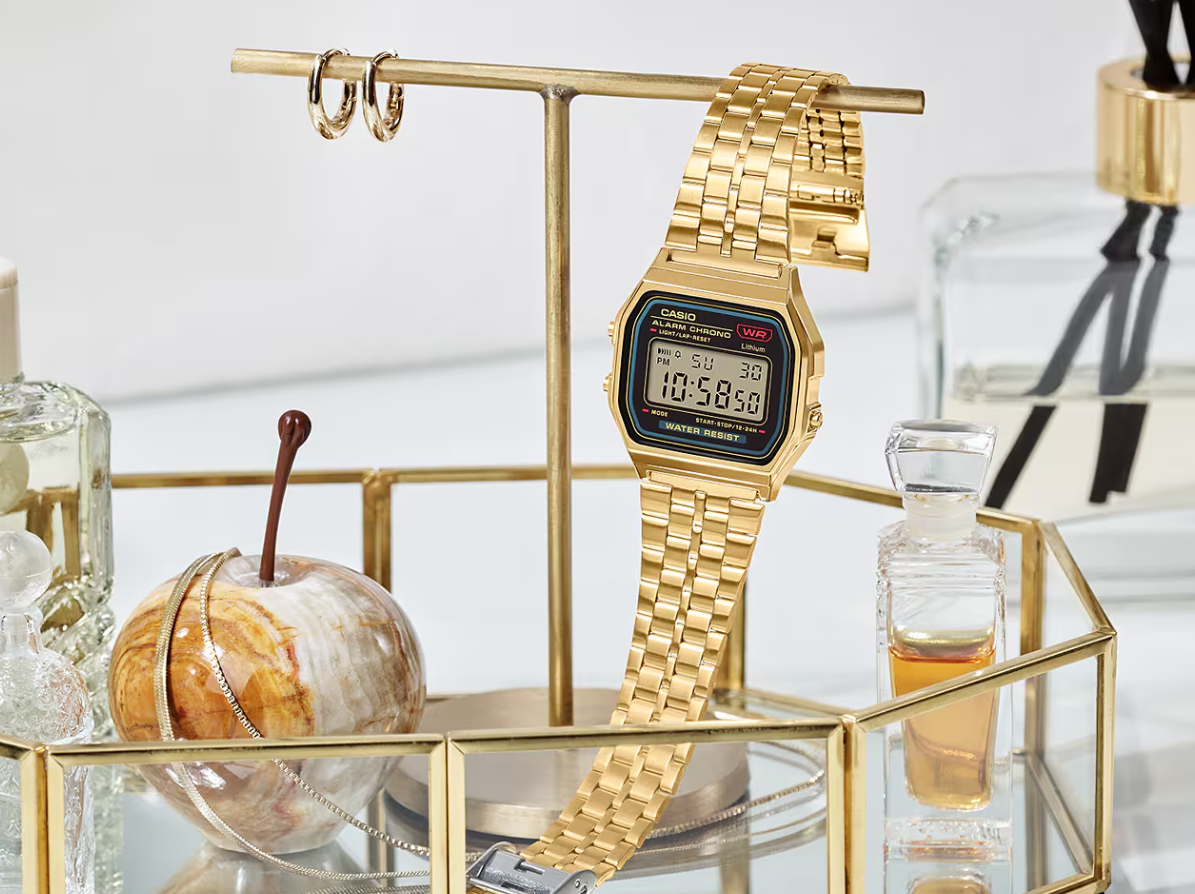 • Chronomètre au 1/100e de seconde • Éclairage LED • Bracelet en acier inoxydable • Étanche • Cadran carré