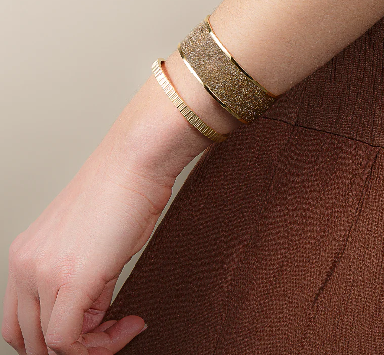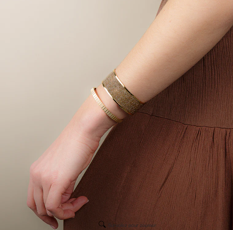 Cette manchette paillettes dorées en acier inoxydable capte la lumière et habille le poignet d’un éclat subtil, tout en offrant confort et élégance au quotidien. Sa conception en acier inoxydable garantit résistance et brillant durable.