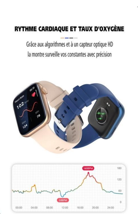 Un coach sportif à votre poignet pour atteindre vos objectifs de fitness : Mode multisport , fréquence cardiaque, pression sanguine, saturation SP02, podomètre, chronomètre, suivi du sommeil
