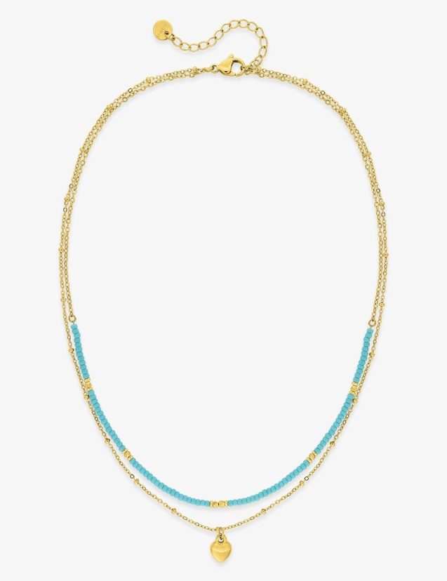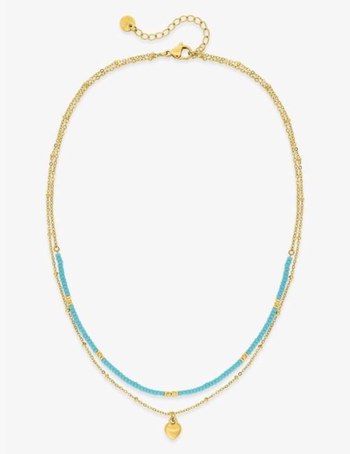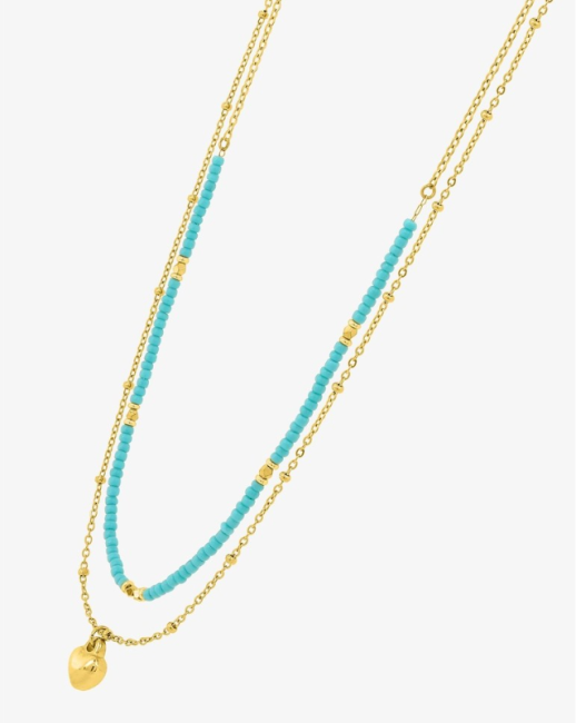 Ce collier à double chaîne est en acier doré, il possède un motif cœur de 7 mm en son centre en acier et des perles de verre bleues de 2 mm. Il mesure 38 cm avec une chaîne de rappel de 5 cm et se ferme grâce à un fermoir mousqueton. Un accessoire élégant, idéal à offrir à un être cher.