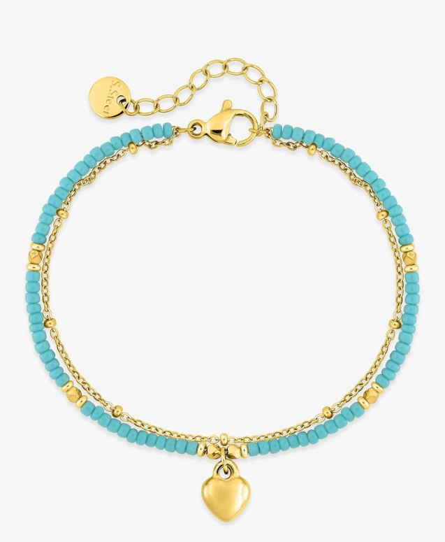 Ce bracelet à double chaîne est en acier doré, il possède un motif cœur de 7 mm en son centre en acier et des perles de verre bleues de 2 mm. Il mesure 16 cm avec une chaîne de rappel de 3 cm et se ferme grâce à un fermoir mousqueton. Un accessoire élégant, idéal à offrir à un être cher.