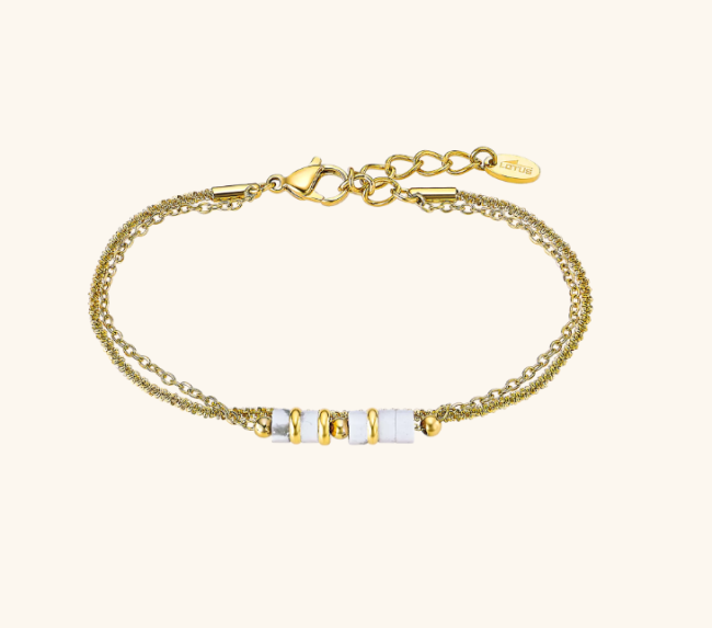 Bracelet ajustable en acier doré double rang perles noires, motif centrale laqué noir et blanc.