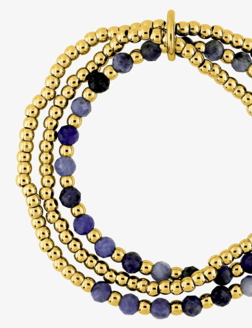 Bracelet en acier inoxydable de la collection APA. Ce bracelet se compose de 3 rangs de motifs boules acier doré alternés par des pierres lapis-lazuli bleu synthétiques. Bracelet élastique taille unique. La collection acier APA s'adresse aux hommes et aux femmes. Ses bijoux en acier inoxydable ont un style original, fantaisie et coloré, vous pourrez pour certains les associer en parure. Vous trouverez forcément celui qui vous correspond dans le vaste choix de cette collection.
