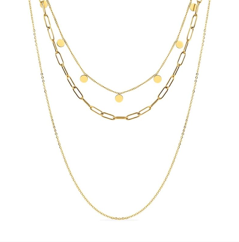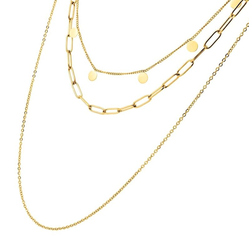 Apportez une touche d’élégance à votre style avec le Collier Femme Trois Rangs Acier Doré. Ce bijou raffiné associe trois chaînes distinctes pour un effet superposé des plus tendances : une chaîne gourmette de 38 cm ornée de délicates pampilles rondes, une chaîne en maille alternée de 43 cm, et une chaîne forçat de 60 cm. Sa longueur ajustable jusqu’à 65 cm permet un tombé parfait sur le décolleté, sublimant chaque tenue avec finesse et éclat.
