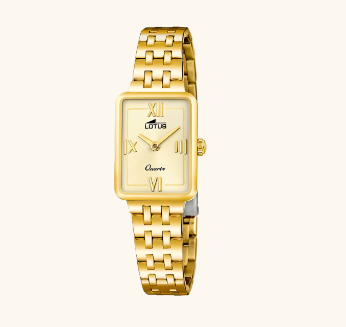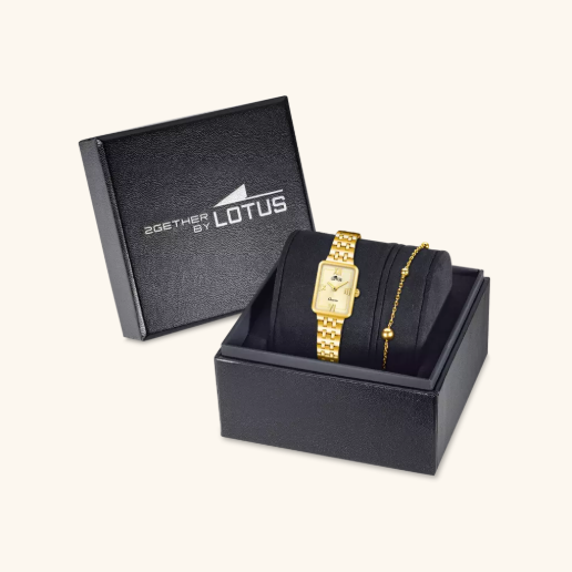 La Lotus 2Gether associe l’éclat d’un cadran champagne à un boîtier rectangulaire en acier inoxydable, une pièce élégante au style classique revisité. Elle est présentée dans un coffret chic avec bracelet assorti, parfaite pour offrir un cadeau distingué.