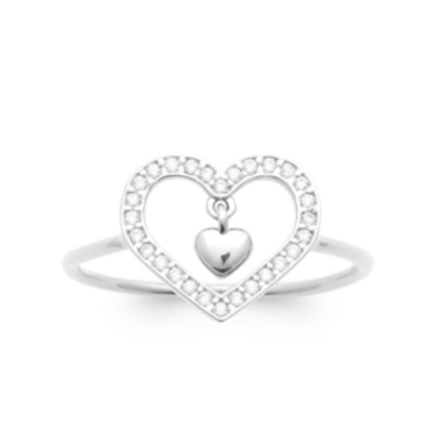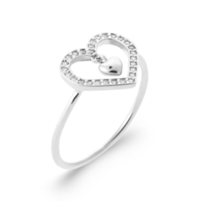 Bague coeur en argent rhodié pavéé d'oxydes blanc et breloque coeur.