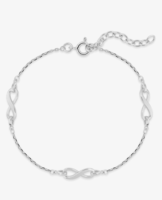 Bracelet en argent rhodié orné de trois motifs infinis qui évoquent l'éternité dans un design symbolique et épuré. Il est équipé d'un fermoir anneau à ressort pour un port sécurisé et ajustable au quotidien et affiche un poids moyen de 2,10 g. avec sa chaîne forçat de 19 cm et son anneau intermédiaire à 16 cm. Son design moderne et chargé de sens avec ses symboles infinis répétés apportera une dimension spirituelle délicate et contemporaine à votre poignet.