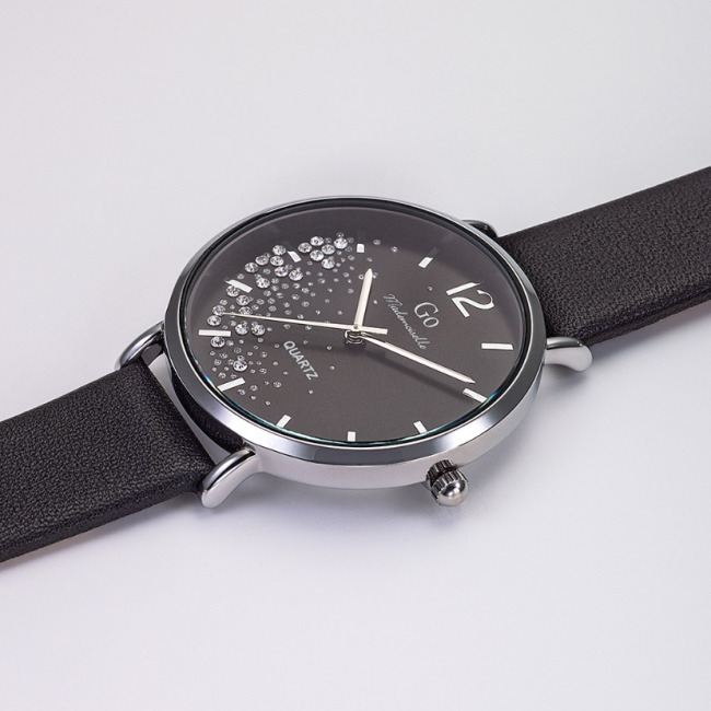 Notre montre Go Mademoiselle au total look noir deviendra l’accessoire indispensable pour compléter toutes vos tenues ! Son boîtier argenté de 36 mm de diamètre affiche de jolies lignes arrondies et abrite un cadran noir élégant et raffiné. Survolé par de fines aiguilles de couleur argentée, il est décoré d’étincelants petits cristaux, à la manière d’une pluie d’étoiles. Pour venir enlacer votre poignet avec confort, notre montre Go Mademoiselle 699355 de la ligne G-24h est dotée d’un intemporel bracelet en cuir d’un noirintense !