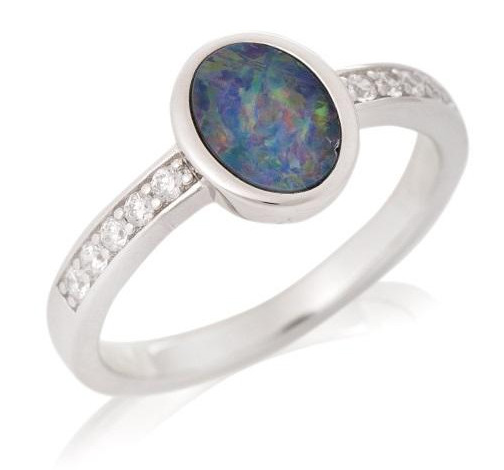 Description | Bague avec opale doublet ovale et oxyde de zirconium, en argent rhodié 925/1000