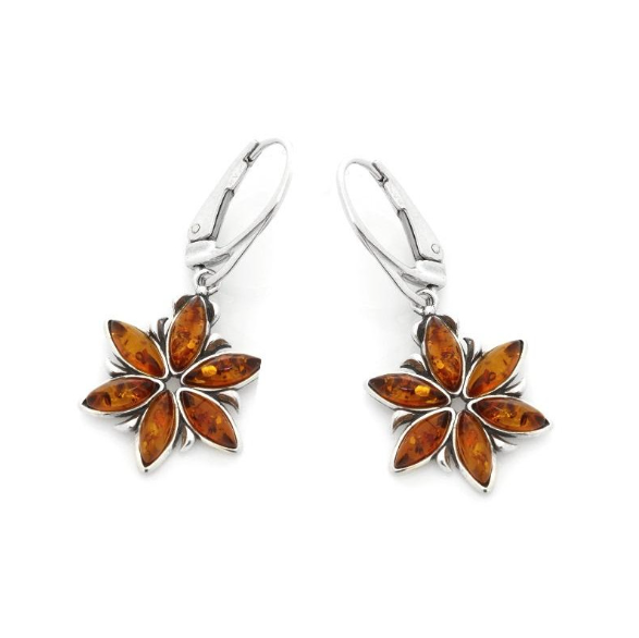 Description | Boucles d'oreilles fleur avec ambre cognac naturel, en argent rhodié 925/1000