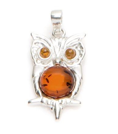 Description | Pendentif chouette avec ambre cognac, en argent rhodié 925/1000, hauteur 2,7+1 cm.