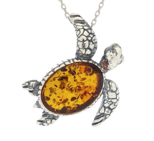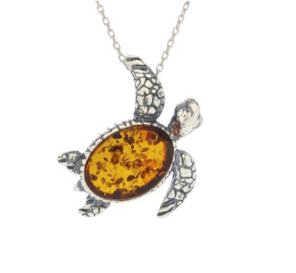 Description | Pendentif tortue avec ambre cognac ovale, en argent rhodié vieilli 925/1000, hauteur 2 cm.