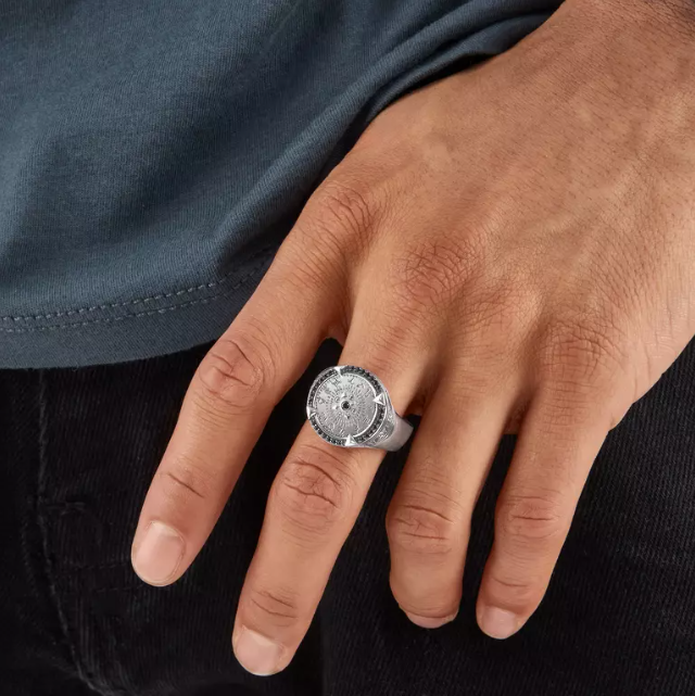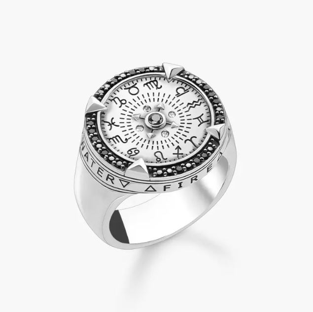 Le design fort de cette chevalière pour hommes est inspiré de la théorie des quatre éléments et de leur signification pour les signes du zodiaque. Minutieusement travaillée, elle est fabriquée en argent sterling 925 recyclé et ornée de nombreux détails sophistiqués. La bague est élaborée en plusieurs couches et décorée de fines lignes ciselées ainsi que de pierres serties. L’insert est gravé des 12 signes du zodiaque, entouré d’un pavé d’oxydes de zirconium noirs et maintenu par quatre montures à griffe solides. La monture arbore les noms des quatre éléments (feu, eau, air et terre) gravés sur son pourtour. Le bijou est extrêmement agréable à porter grâce au corps de bague arrondi.