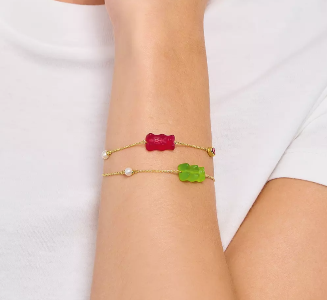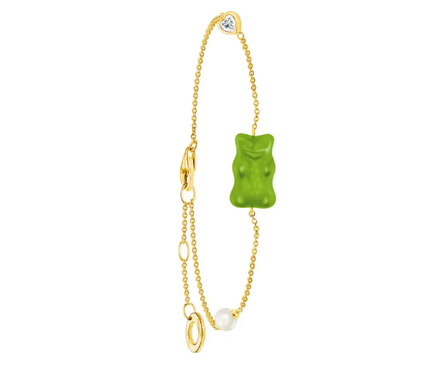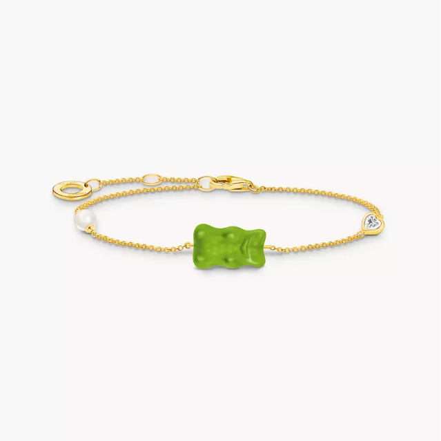 Il est confectionné en cristal vert de qualité supérieure, résistant à la casse et légèrement satiné et orné au verso de la gravure THOMAS SABO x HARIBO. Il est accompagné d’une petite perle de culture d’eau douce et d’une zircone rouge taillée en cœur. En tant que fan du fameux ours gélifié, associez le bracelet avec tout – comme clin d’œil avec une tenue élégante ou comme complément parfait de votre look Y2K.