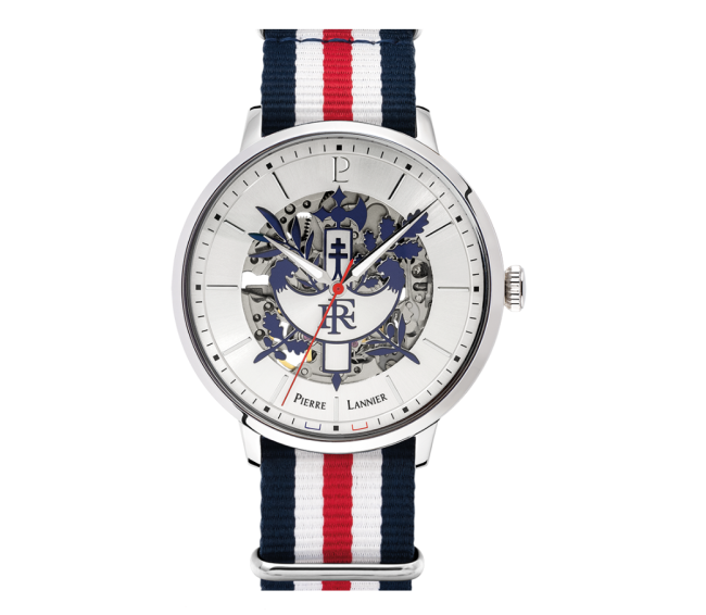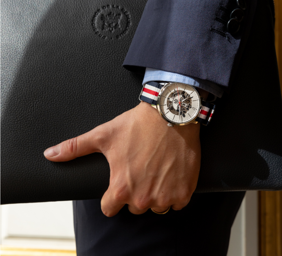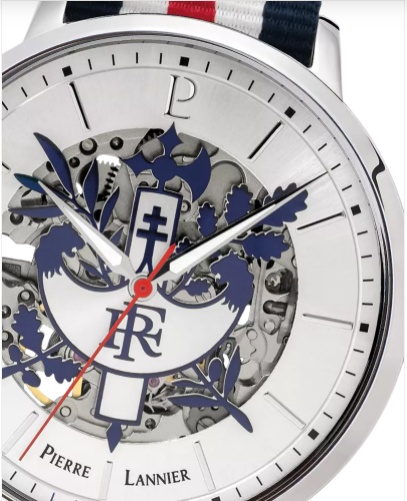 La montre automatique, au cadran squelette et boîtier en acier inoxydable de 42 mm de diamètre, dévoile l’emblème de l’Élysée et de la République Française, affirmant son caractère unique. Dotée d’une réserve de marche de 42 heures et étanche jusqu’à 50 mètres, elle allie technicité et élégance intemporelle.