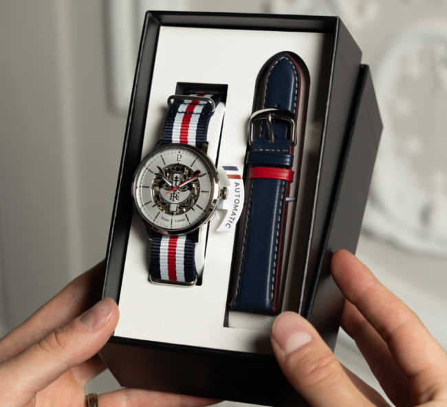 Fabriqué avec soin en France, le coffret exclusif, en partenariat avec le Palais de l’Élysée, inclut une montre automatique équipée d’un bracelet NATO tricolore et un bracelet supplémentaire en cuir bleu. Un hommage unique au savoir-faire horloger français et aux valeurs de la République.