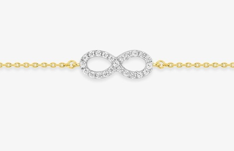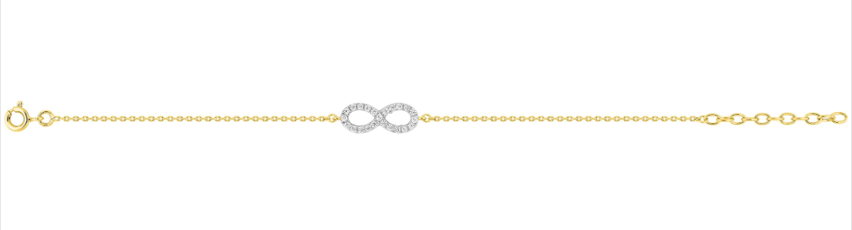 Au centre de cette chaîne forçat se trouve un motif infini en rhodium serti d'oxydes de zirconium qui mesure 16 mm de longueur. Le bracelet mesure 16 cm plus 3 cm de chaîne de rappel et possède un fermoir en anneau ressort.