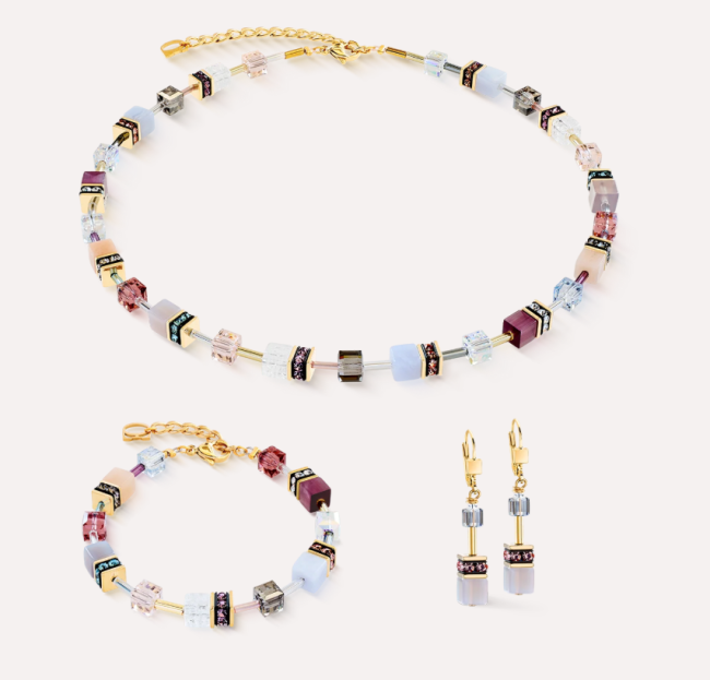 Le bracelet GeoCUBE® Iconic Precious Golden Blush complète la parure avec la même harmonie de couleurs. Calcédoine, agate, aventurine rose, cristal de roche et œil de tigre synthétique sont sublimés par des cristaux Swarovski® et des rondelles strass étincelantes.