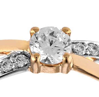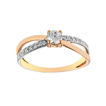 Solitaire accompagné bicolore, or rose et or blanc rhodié 9 carats, serti d'un oxyde de zirconium central de 4mm, pavage oxydes de zirconium.