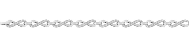 Bracelet en argent 925 ‰ rhodié dont la chaîne est constituée de signes "infinis" reliés à demi sertis d'oxydes de zirconium ronds et blancs qui créent une composition symbolique et scintillante. Il est équipé d'un fermoir pour un port sécurisé et pratique au quotidien et affiche un poids moyen de 12,60 g. avec une longueur de 17,5 cm. Son design symbolique et étincelant avec ses motifs "infinis" pavés apportera une dimension spirituelle et raffinée à votre poignet.