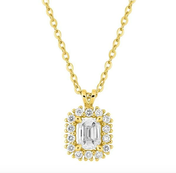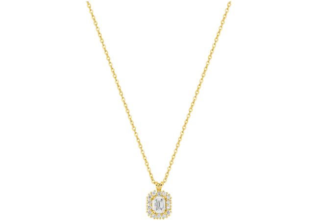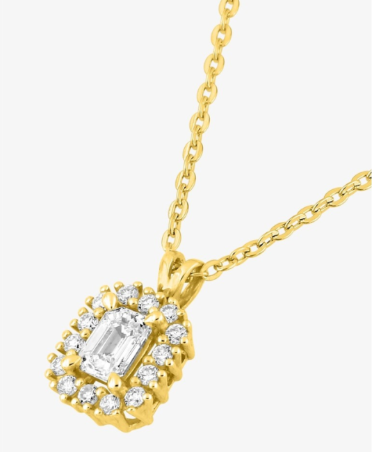 Collier en or 375 ‰ (9 carats) jaune avec un pendentif de 6x7 mm orné diamants de laboratoire totalisant 0,36 ct. La pierre centrale de 0,25 ct créera un point de lumière qui mettra en valeur votre décolleté. Ce collier affichant un poids d'or moyen de 1,55 g, dispose d'un fermoir anneau ressort et d'une longueur de 45 cm, avec anneaux intermédiaires à 40 et 42 cm, pour un ajustement parfait.