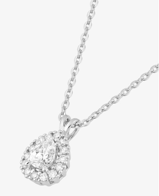 Collier en or 375 ‰ (9 carats) blanc avec un pendentif de 7x6 mm orné diamants de laboratoire. La pierre centrale en forme de poire créera un point de lumière qui mettra en valeur votre décolleté. Ce collier affichant un poids d'or moyen de 1,50 g, dispose d'un fermoir anneau ressort et d'une longueur de 45 cm, avec anneaux intermédiaires à 40 et 42 cm, pour un ajustement parfait.