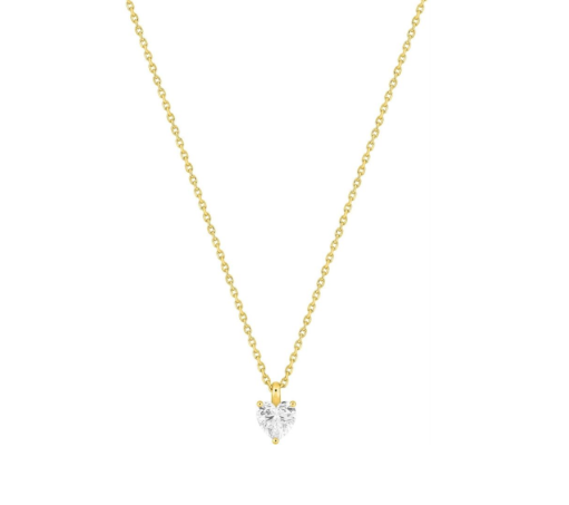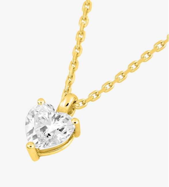 Collier en or jaune 750 ‰ (18 carats) orné d'un diamant de laboratoire taille cœur de 0,38 ct serti par 3 griffes. La longueur de 45 cm avec anneau intermédiaire à 42 cm permet un ajustement pratique et le poids d'or moyen du bijou est de 2,35 g. Ce collier romantique exprime vos sentiments avec délicatesse grâce à sa forme symbolique qui touche le cœur.
