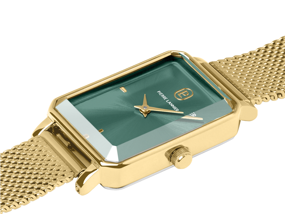 Son cadran, rehaussé d’index fins et d’aiguilles dorées, apporte une touche d’élégance subtile. Le boîtier rectangulaire, en acier doré épouse parfaitement la forme du poignet, offrant une allure à la fois chic et contemporaine.