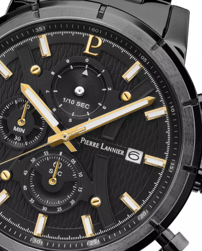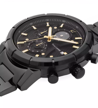 Son boitier rond noir, en acier inoxydable fait 45 mm de diamètre. La lunette noire, au fini brossé, offre un contraste élégant avec le boîtier. Le cadran texturé en noir arbore des éléments en relief en forme d'arc de cercle, tandis que les compteurs sont réglables via deux poussoirs et une couronne : la date à 3h, les secondes à 6h, les minutes à 9h, et même les dixièmes de seconde à 12h. Les secondes sont minutieusement marquées autour du cadran, avec des aiguilles et des index en doré et blanc pour un contraste saisissant.