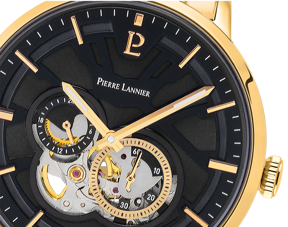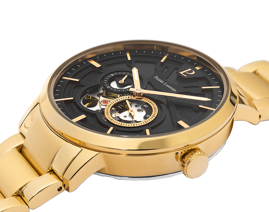 Son cadran noir mystérieux fusionne harmonieusement avec son bracelet, créant ainsi une fusion captivante entre l'élégance et la personnalité affirmée. Le boîtier doré de 42 mm minutieusement conçu abrite un cadran en squelette noir qui dévoile subtilement le mouvement intérieur Les index et les aiguilles dorés, à la finition brillante, offrent une parfaite lisibilité tout en ajoutant une touche d'élégance.